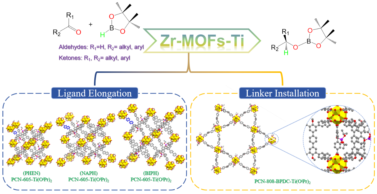 图为适用于大尺寸羰基底物硼氢化的锆基金属有机骨架(Zr-MOFs)孔道尺寸调控策略图。